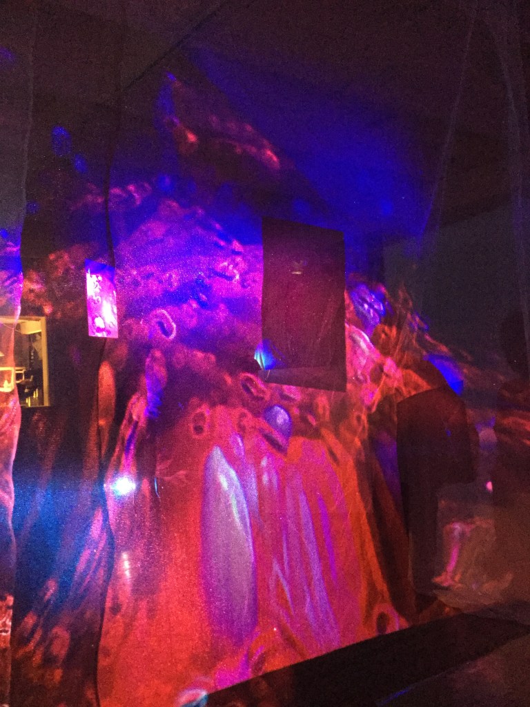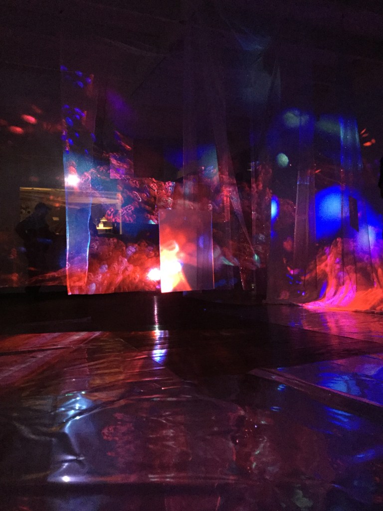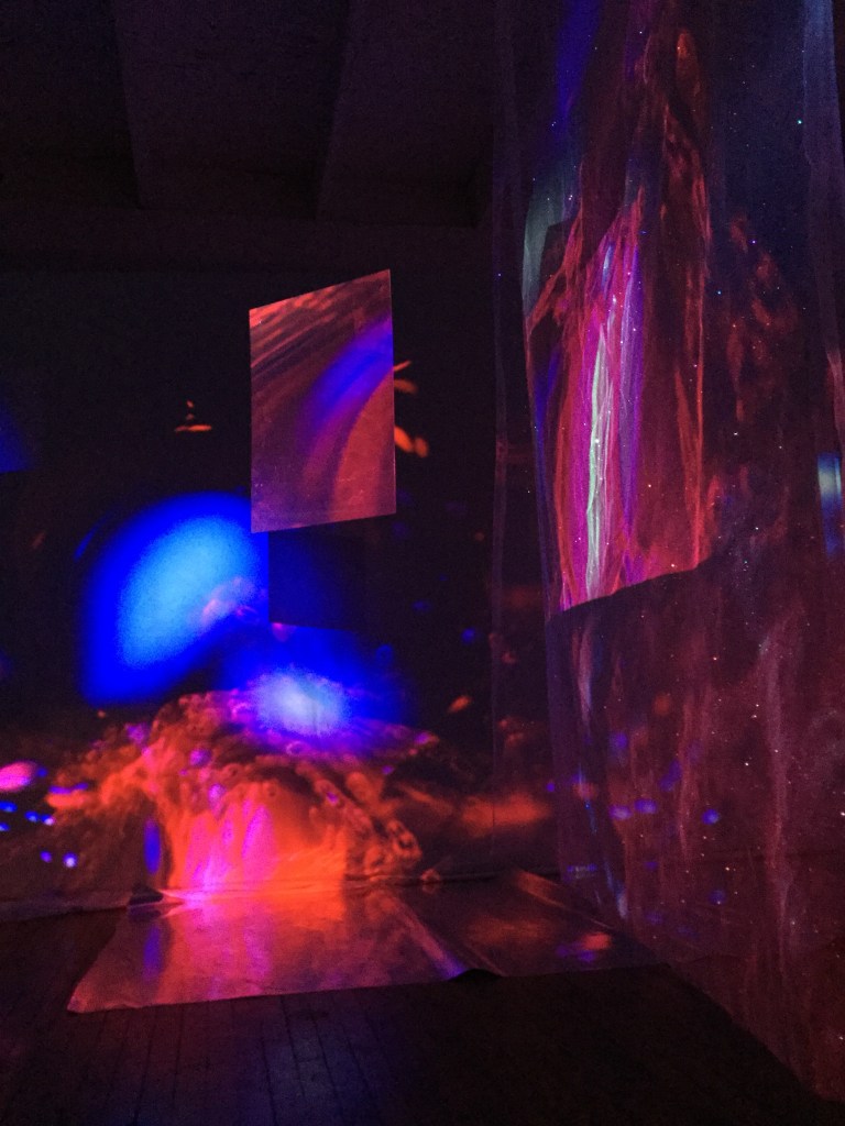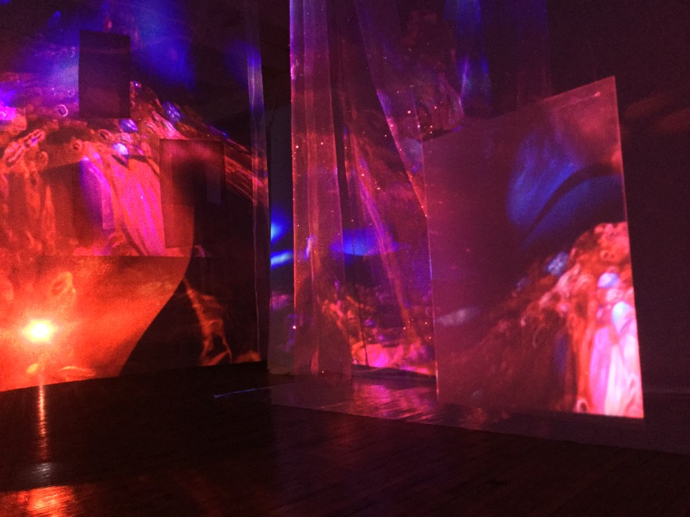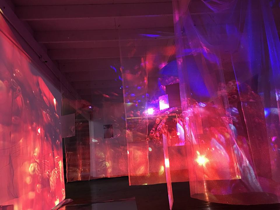This site specific installation uses light projection and video to focus on psychological narratives of body, memory, and perceptual light shifts. She explores light as mediated through a spectrum of materials, including fiber/acrylic constructions, animation, and digital processing. Each site specific, interactive installation creates an immersive environment for the viewer to experience within a particularly composed architectural space. This phenomenological installation provides metaphoric portals to sublime light and dark visions of liminal space based on an experience of being exiled in an alternate universe which is both tragic and sensual, sinister and soothing. Slow, mesmerizing animations play in seamless loops, meant to evoke an alien, viscous world of vascular tides. The animations are made from altered layers of abstracted still images. These photographs of light and reflection are taken in the dark and express conflicting and sublime emotions about the nature of light and dark.